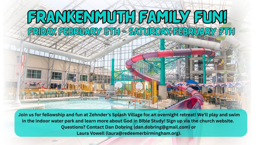 Families of all shapes and sizes are invited to join us for fellowship and fun at Zehnder’s Splash Village for an overnight retreat! We’ll play and swim in the indoor water park and learn more about God’s Word together!