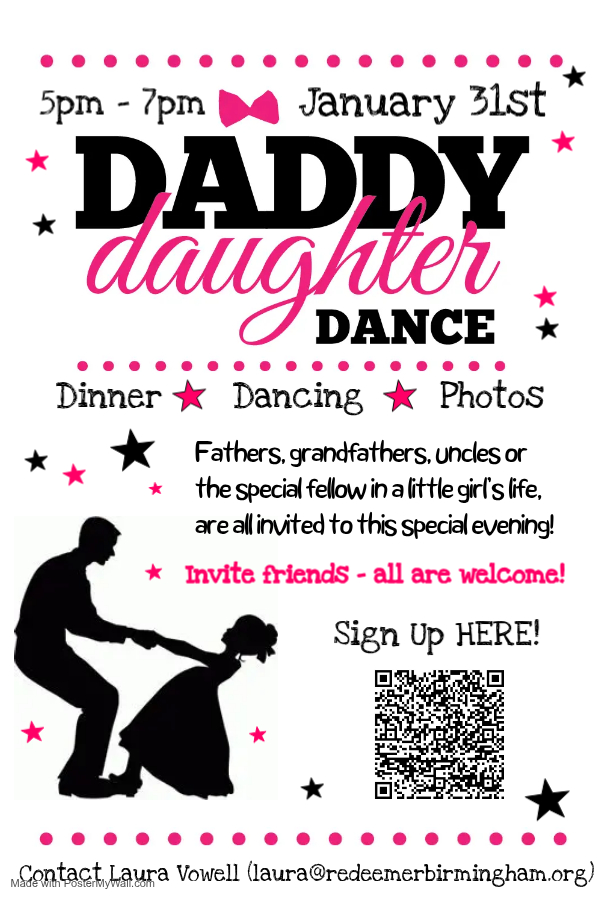 Daddy Daughter Dance! Join us for this special evening on Saturday, January 31st from 5pm – 7pm! Fathers, grandfathers, uncles, or that special fellow in a little girl’s life, are all invited for an evening of dinner & dancing! All are welcome, so feel free to invite friends! Please sign up here or the Town Square bulletin board. Contact Laura Vowell (laura@redeemerbirmingham.org) with questions or for more information.